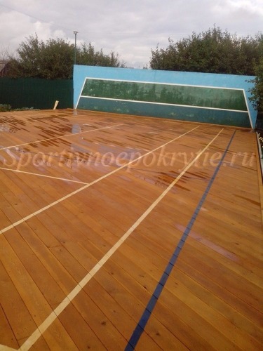 После создания трафарета по нему была нанесена разметка двухкомпонентной разметочной краской FORBO. Теннис - основная линия разметки (белая). Линии бадминтона синего цвета. Разметка стритбола красного цвета, но на данной фотографии её не заметно. После высыхания разметки площадка была покрыта специальным лаком.