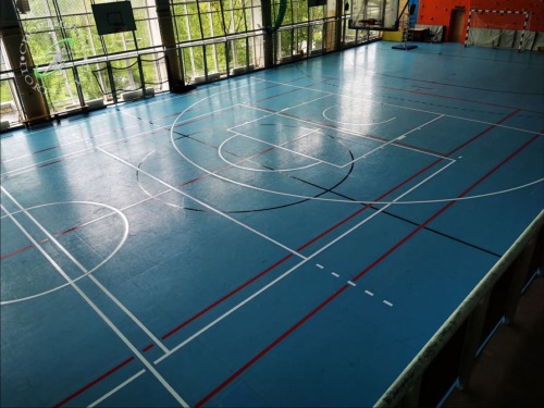Произведена разметка двух спортивных залов по разным игровым видам спорта в Московском физико-техническом институте по адресу: город Долгопрудный, ул. Первомайска 30. Параллельно был сделан демонтаж старых разметочных линий из скотча, что вызвало нюансы: после снятия скотча на полу оставались следы клея. На такую поверхность нельзя наносить краску, так как в последствие она не будет держаться на покрытии.