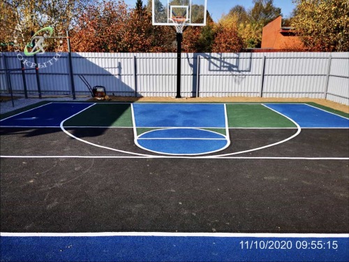 Разметка для игры в стритбол (игра на одно кольцо) на покрытии из резиновой крошки по адресу: Московская область, посёлок Тучково. Покрытие из резиновой крошки выполнено согласно проекту, в котором используется несколько цветов.