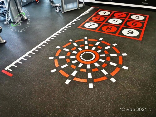Разметка в фитнес-клубе фигур для функционального тренинга, а именно: Plex Square, Classic Compass Multi Metre. Адрес: Москва, ул. Смоленская, 8.