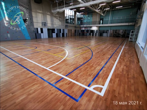 Разметка большого и малого спортивного зала на паркетном полу по баскетболу, волейболу, мини-футболу в новой школе по адресу: Москва, Потаповская Роща, 24к3.